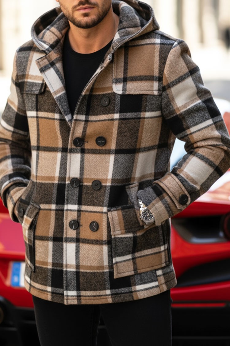 - Palton pentru bărbăti practic, de culoare bej, cu model în carouri, confecționat dintr-un material călduros și de înaltă calitate.