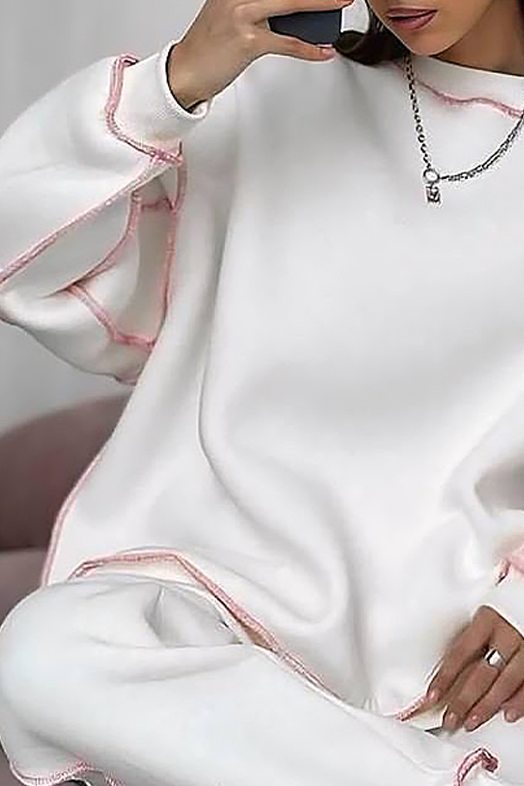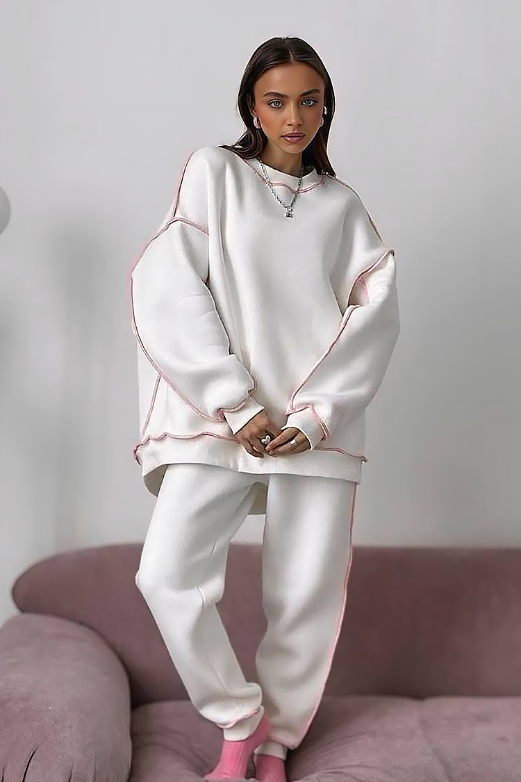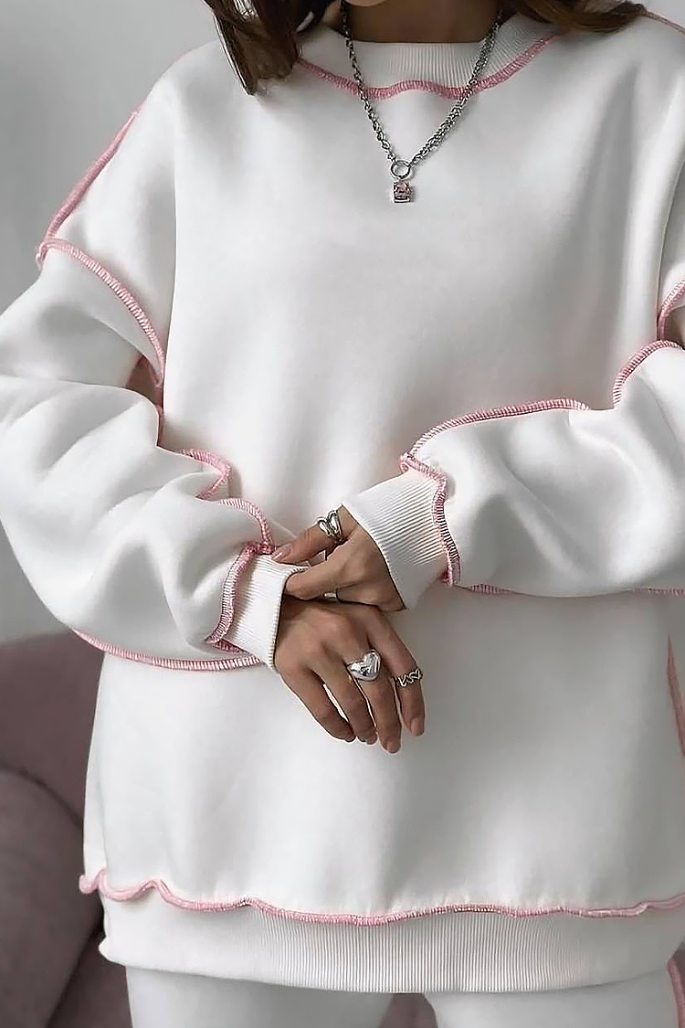 - Bluza are o croială lejeră și un decolteu rotund, iar pantalonii au talie înaltă și picioare late cu elastic la capăt.