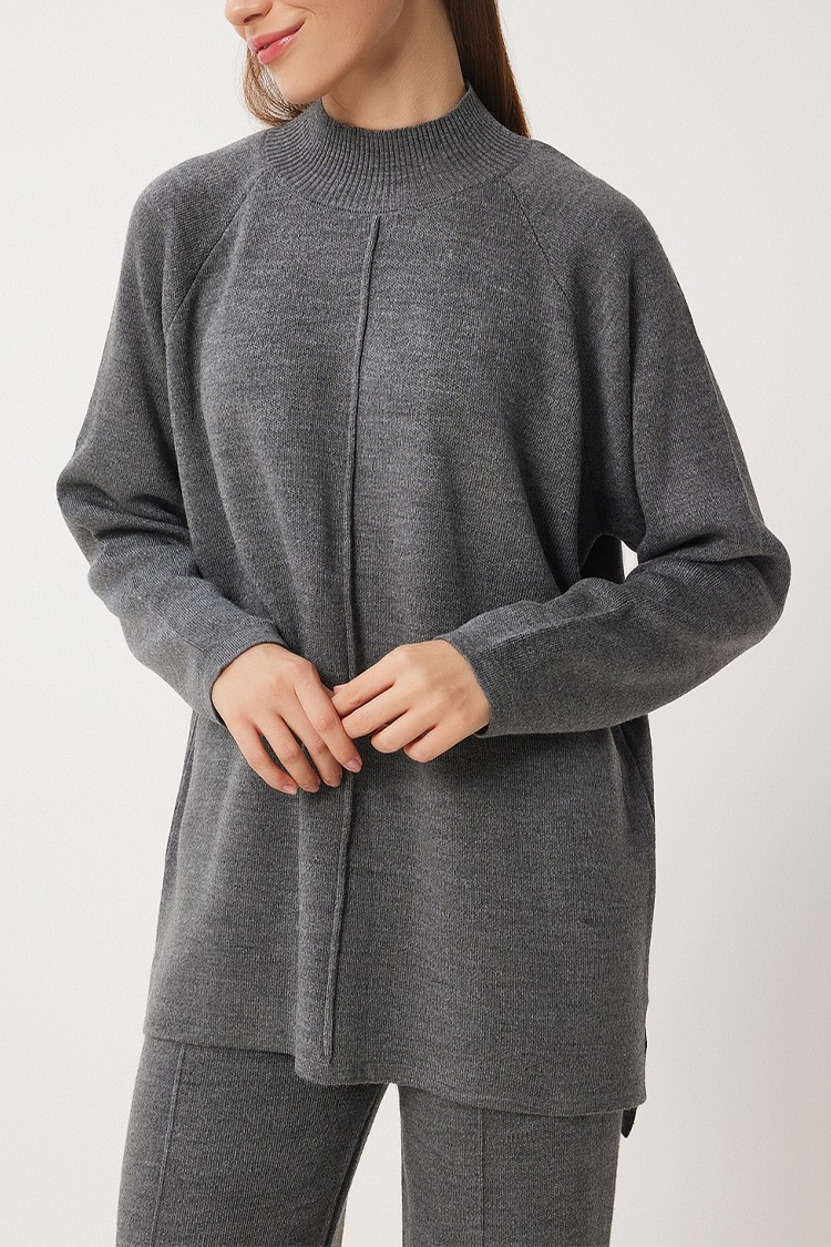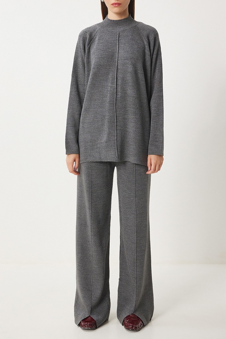 - Puloverul are o croială lejeră și guler de tip polo, iar pantalonii au talie înaltă și o croială lejeră.