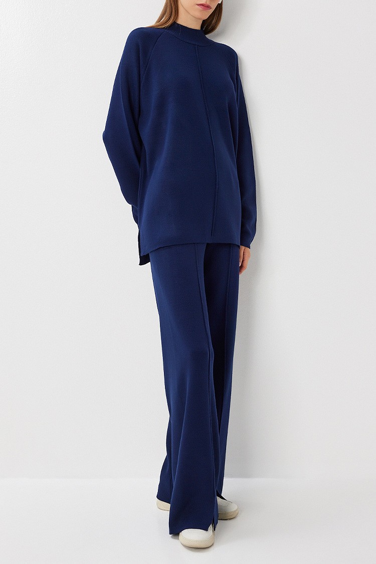 - Puloverul are o croială lejeră și guler de tip polo, iar pantalonii au talie înaltă și o croială lejeră.