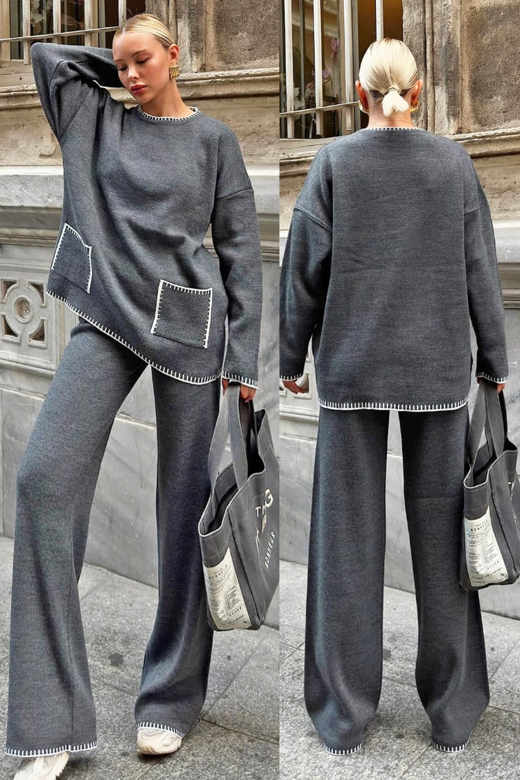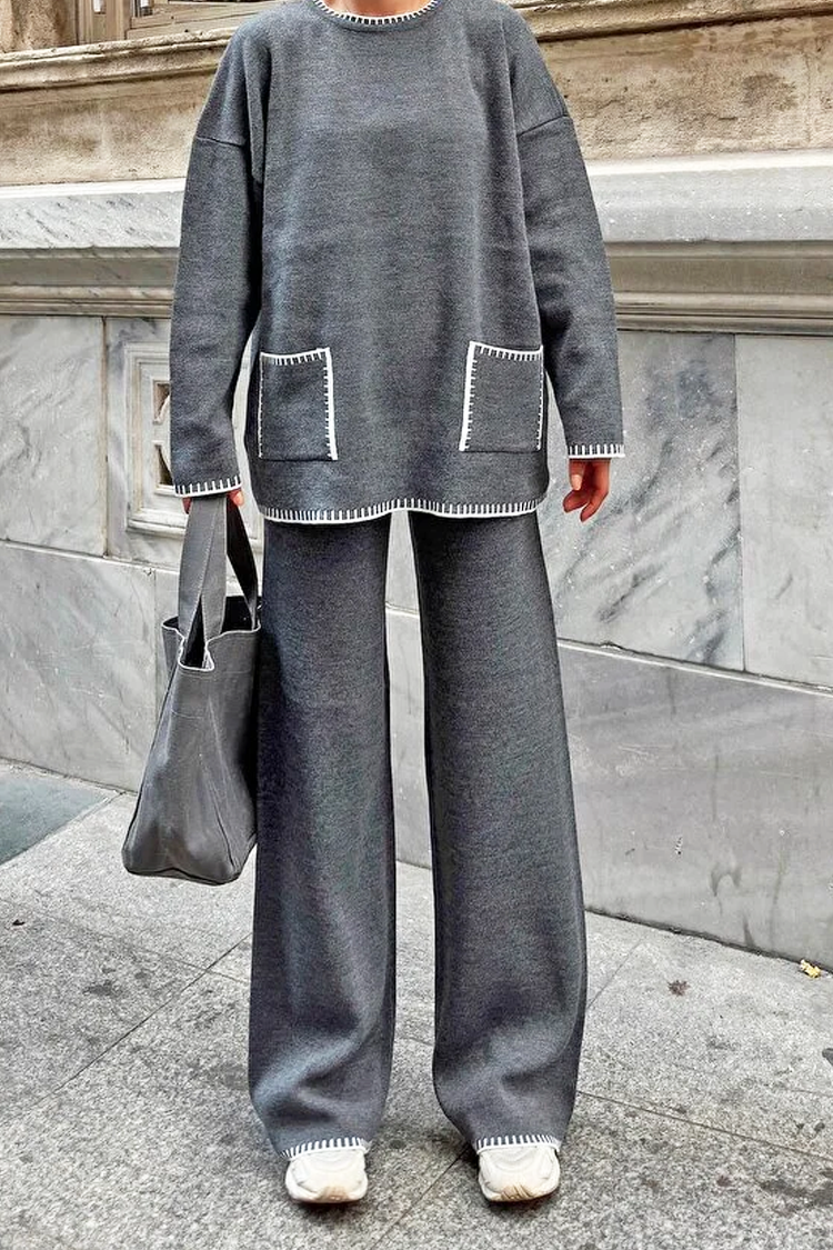 - Puloverul are o croială clasică și buzunare, iar pantalonii au talie înaltă și o croială lejeră.