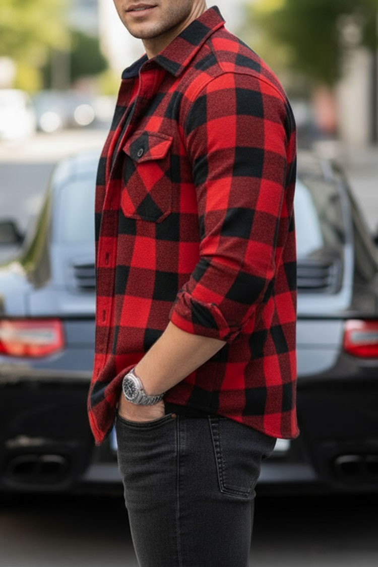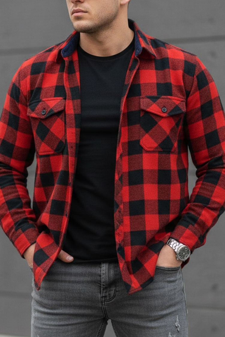 - Cămașă pentru bărbăti modernă, cu model în carouri de culoare roșie, cu guler ascuțit și buzunare mari cu clapă.