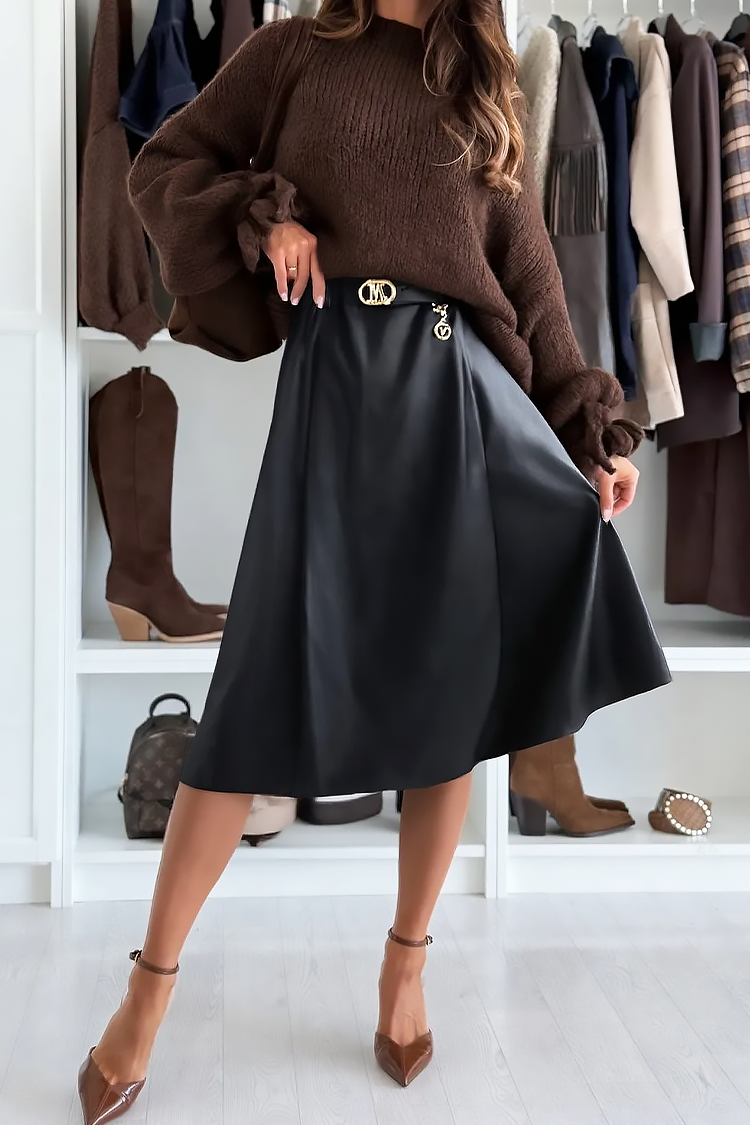 - Fustă midi elegantă și delicată din piele ecologică, potrivită pentru diverse ocazii de modă.