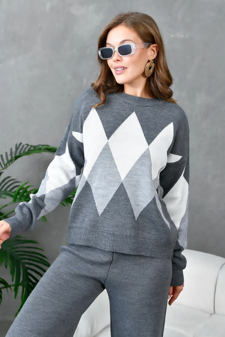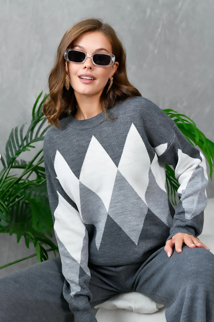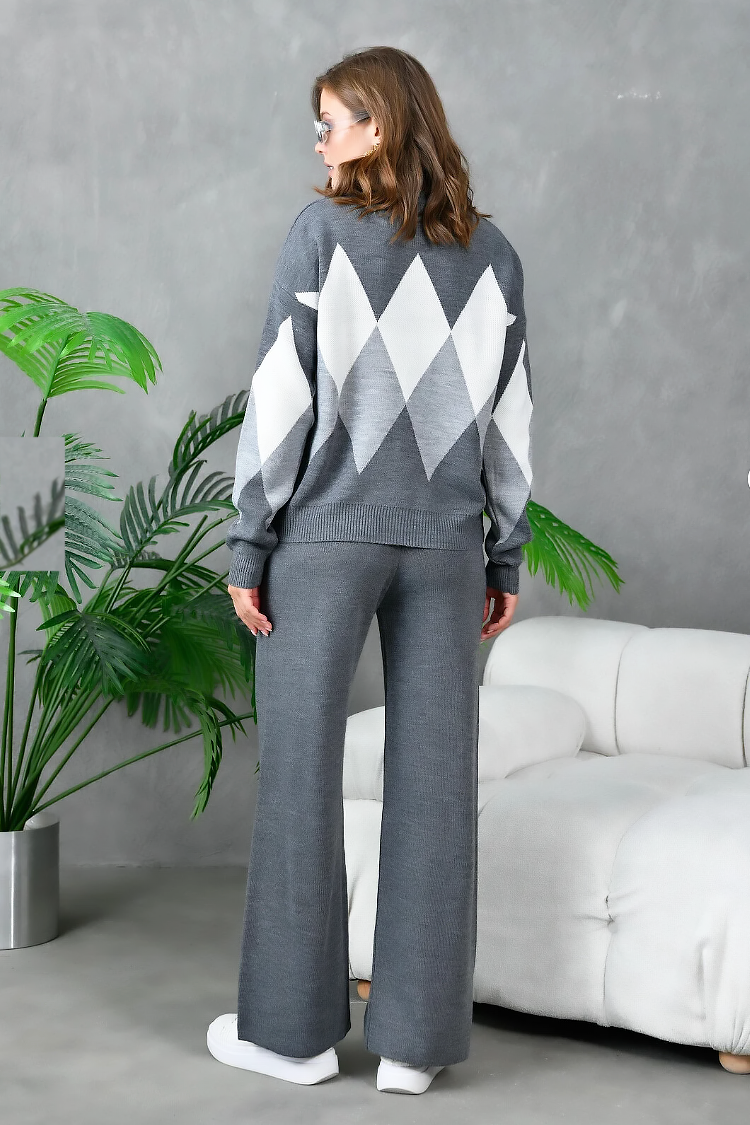- Bluza are o croială lejeră, iar pantalonii au talie înaltă și picioare late.