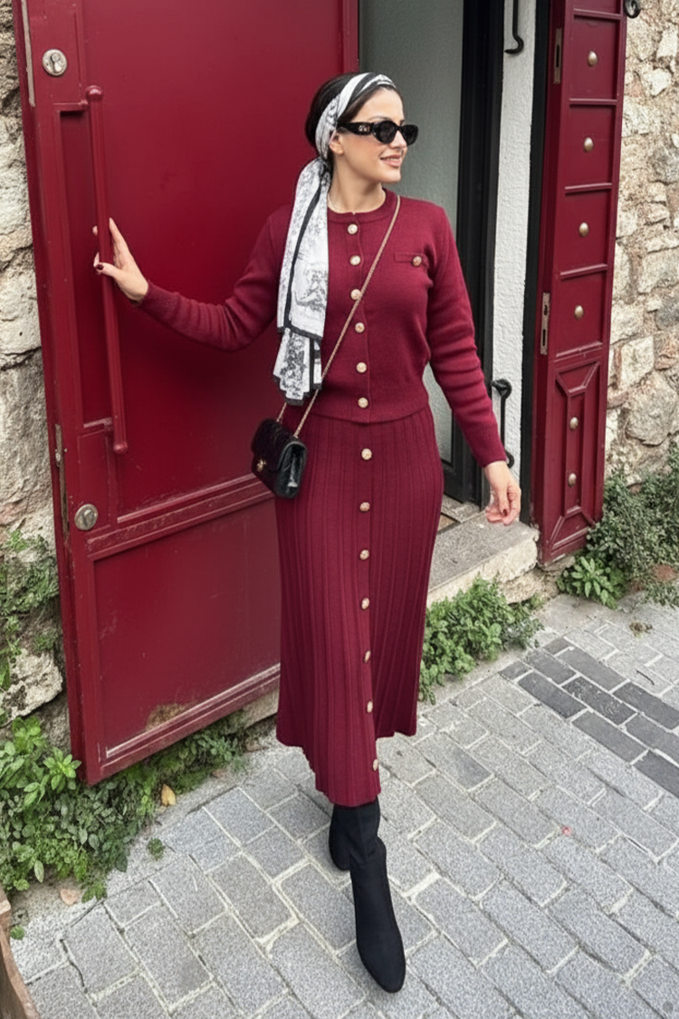 - Modelul are o fustă midi cu nasturi spectaculoși pe lungime și un cardigan cu o croială clasică.