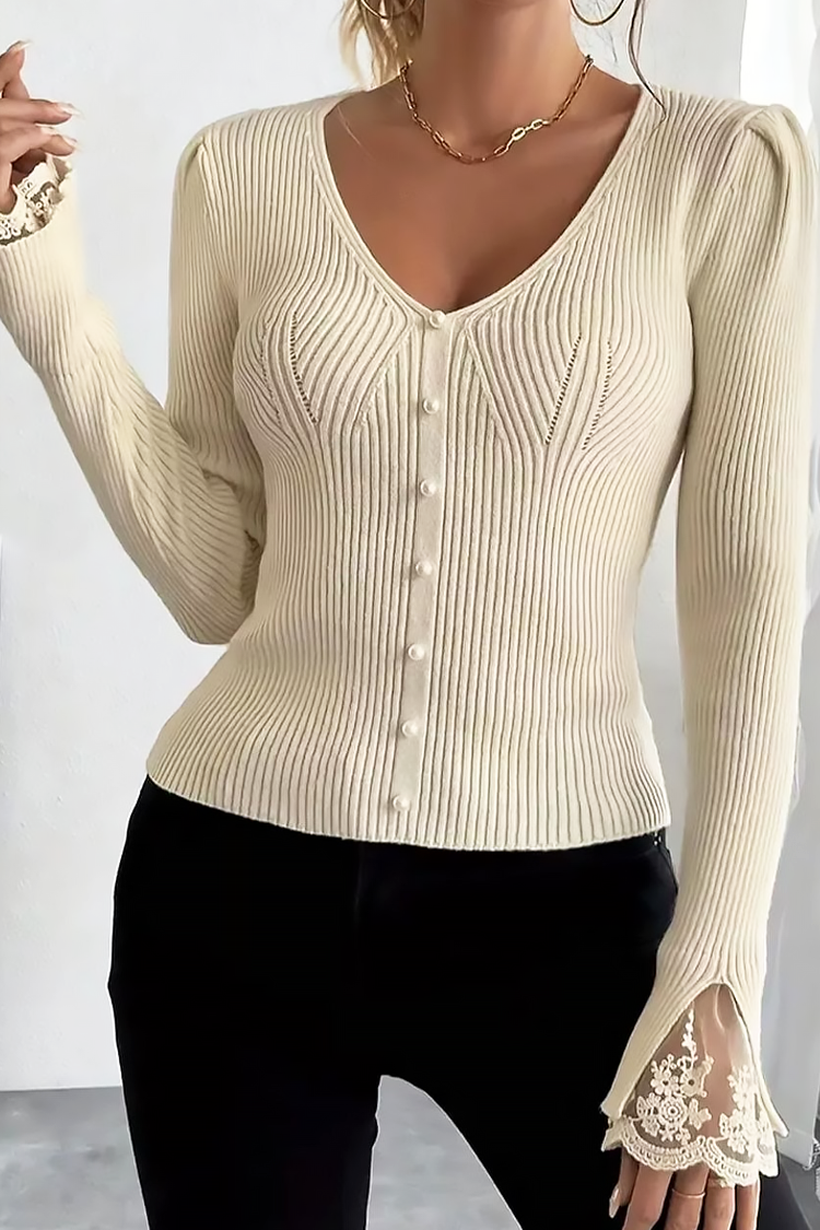 - Bluza are mâneci lungi, nasturi decorativi, o croială mulată și un accent elegant din dantelă.