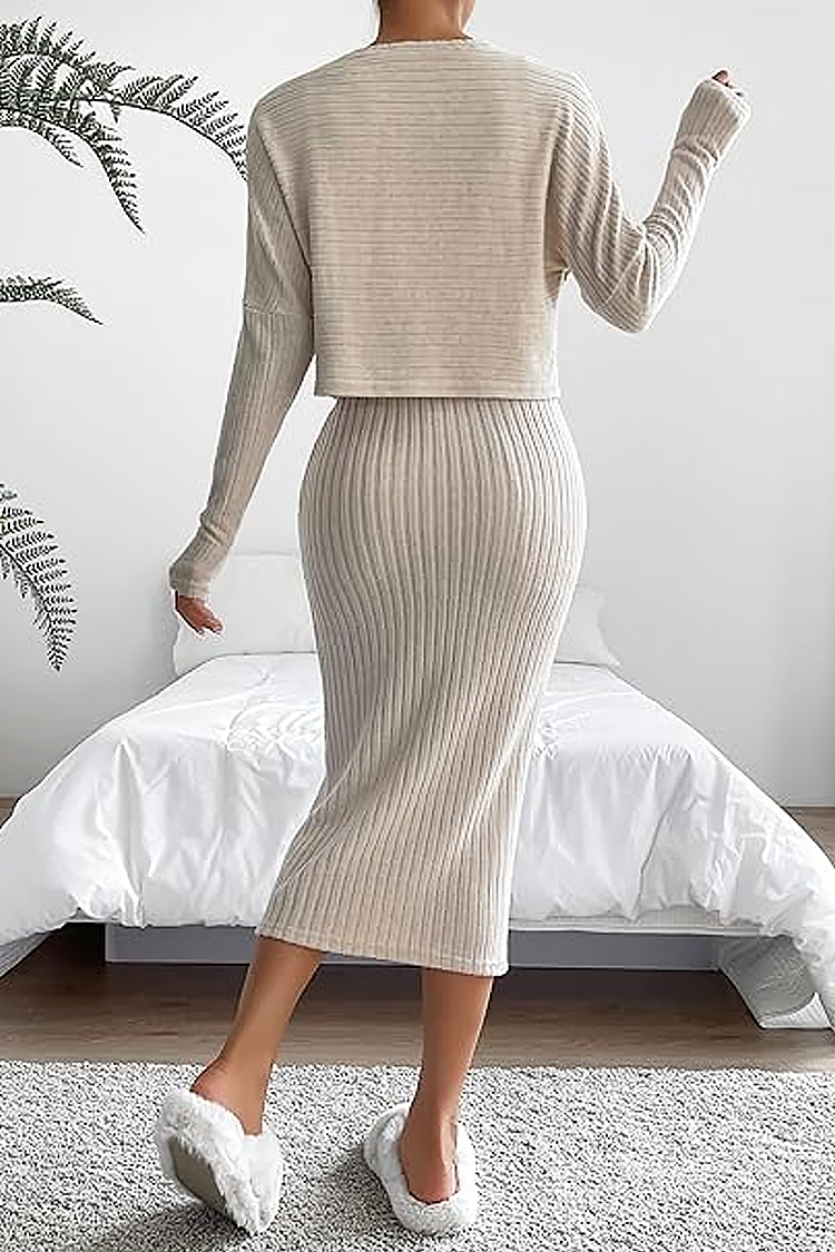 - Puloverul are o croială lejeră, iar fusta are lungime midi.