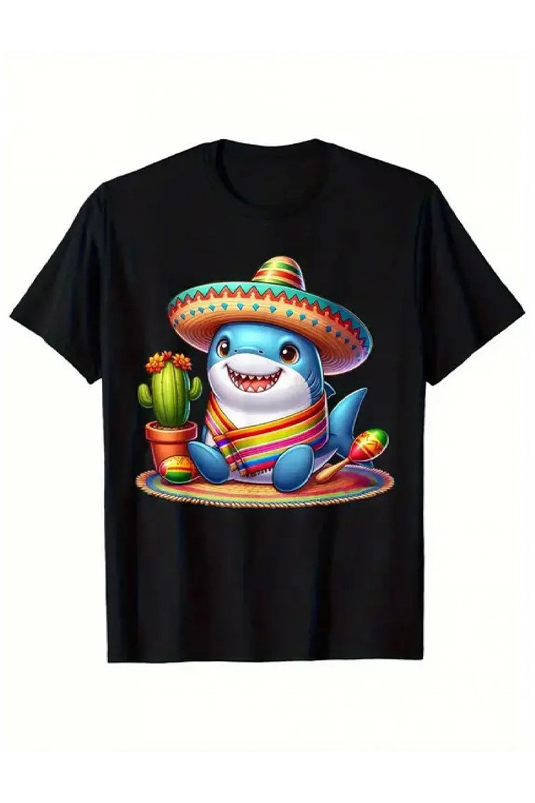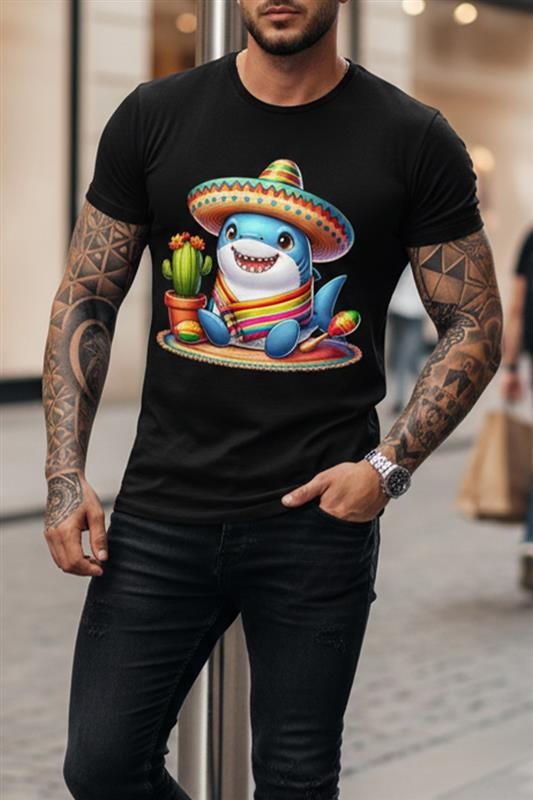 - Tricou pentru bărbăti practic, cu o croială confortabilă și un imprimeu cu rechini, potrivit pentru viața de zi cu zi, pentru o plimbare sau ca o completare a ținutei tale sport.