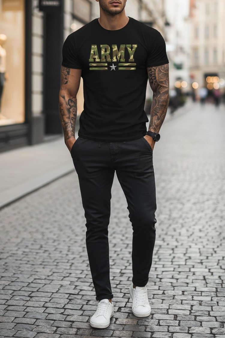 - Tricou pentru bărbăti practic, cu o croială confortabilă și un imprimeu de camuflaj potrivit pentru viața de zi cu zi, pentru o plimbare sau ca o completare a ținutei tale sport.