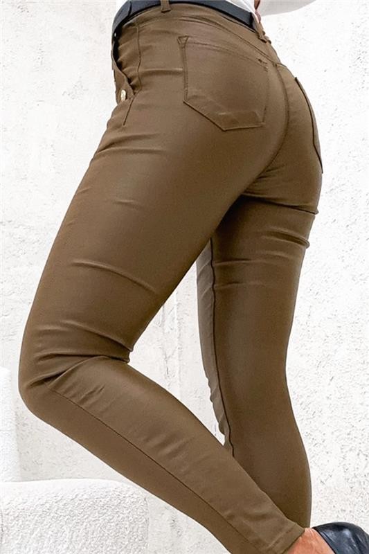 - Modelul are talie înaltă cu legături și buzunare laterale cu nasturi.
