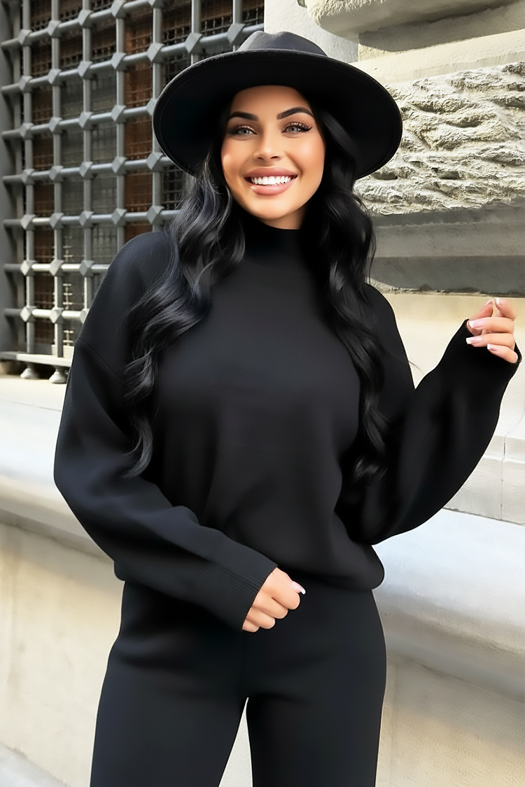 - Puloverul are guler înalt și o croială asimetrică, iar pantalonii au talie înaltă și picioare late.