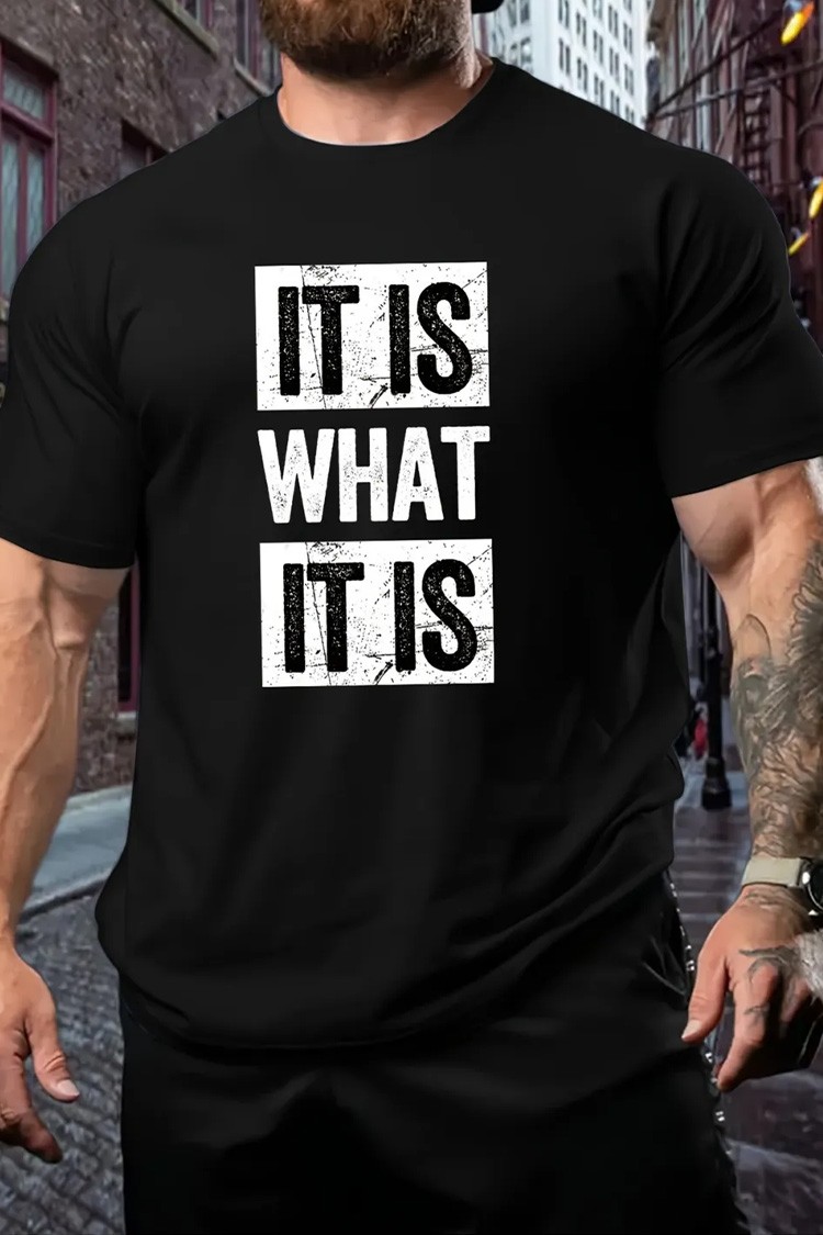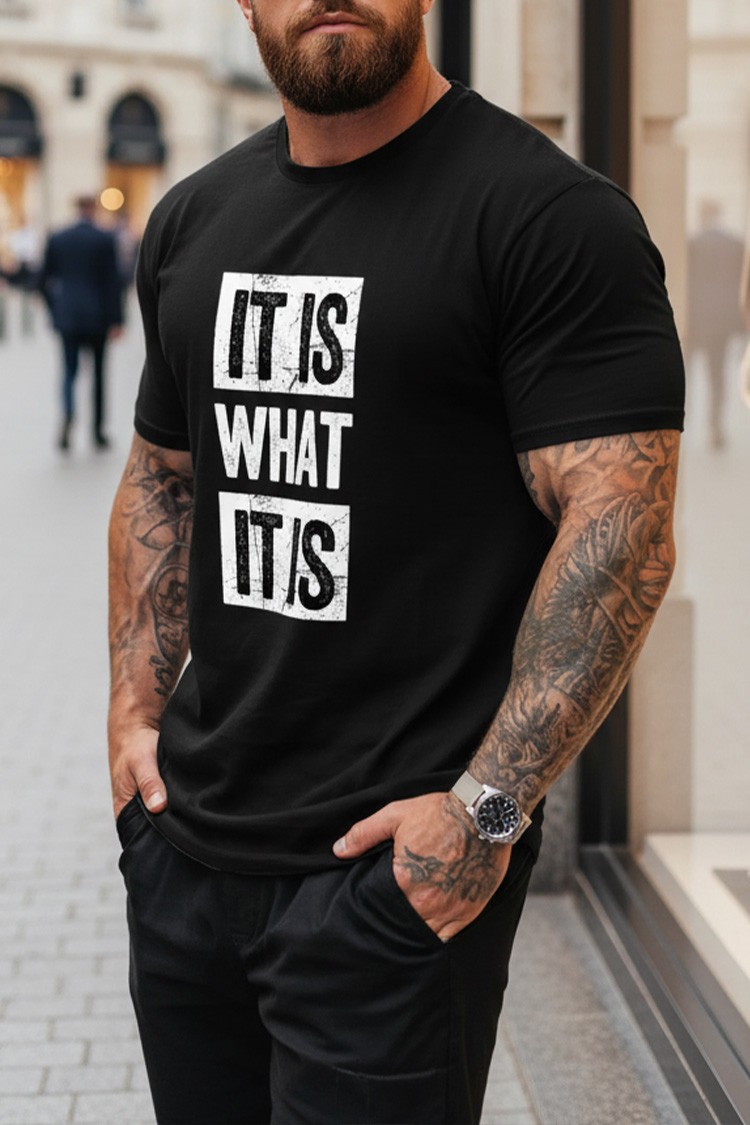 - Tricou pentru bărbăti practic, cu o croială confortabilă și imprimeu “it is what it is “ potrivit pentru viața de zi cu zi, pentru o plimbare sau ca o completare a ținutei tale sport.