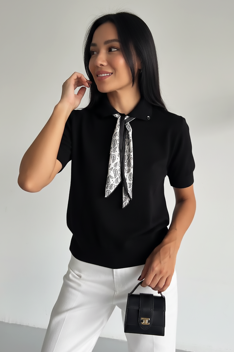 - Modelul impresionează printr-o croială elegantă, guler stilat, mâneci scurte și o eșarfă decorativă.