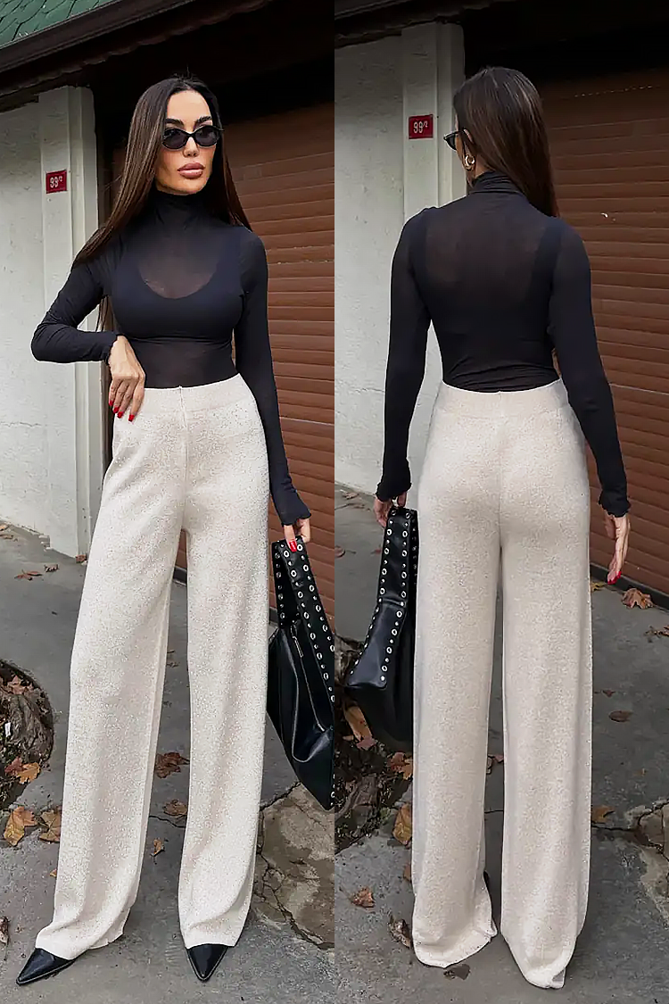- Modelul are talie înaltă și elastică, o croială dreaptă și lejeră și un efect strălucitor.