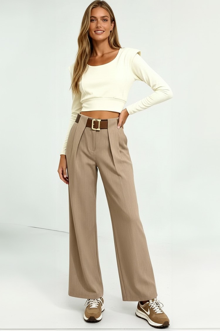 - Modelul are o talie înaltă și spectaculoasă, croială dreaptă și o curea din piele ecologică.