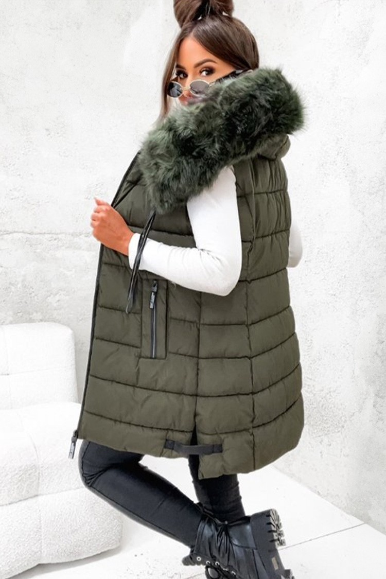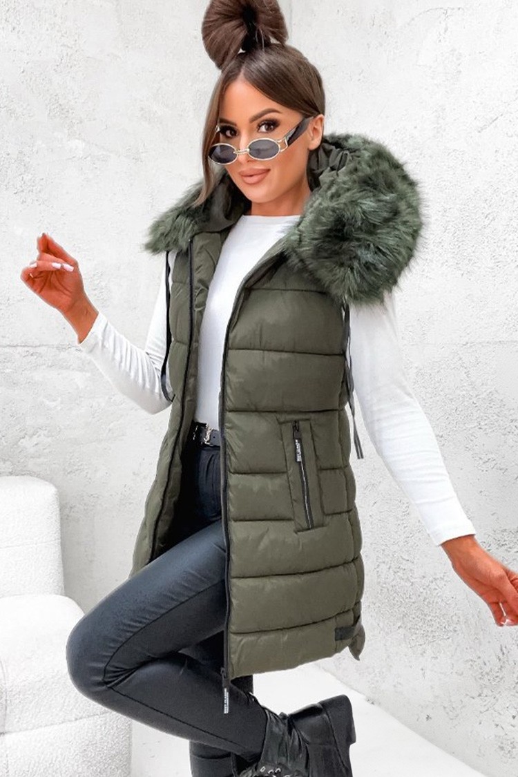 - Vesta are o croială clasică, o glugă confortabilă cu puf și o lungime lungă.