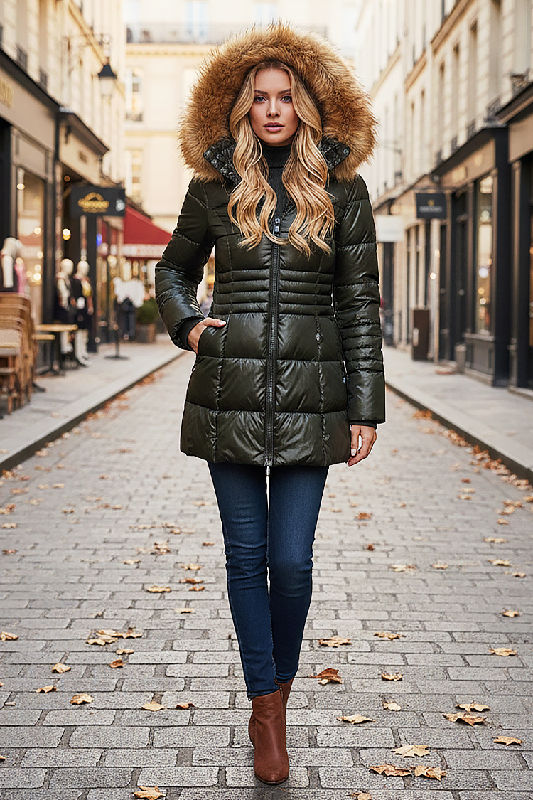 - Modelul are glugă cu puf și buzunare practice cu un design matlasat.Închidere cu fermoar dublu pe toată lungimea.