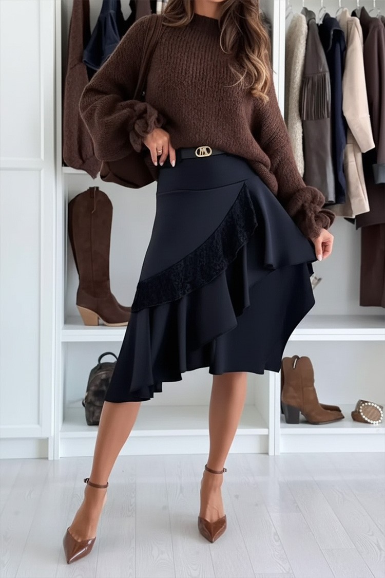 - Fustă midi elegantă și delicată, de culoare neagră, potrivită pentru diverse ocazii vestimentare.