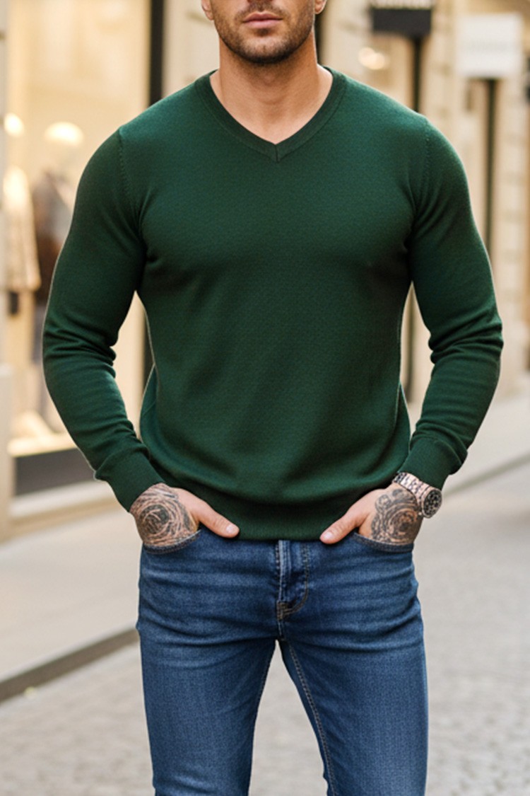- Pulover pentru bărbăti model basic cu decolteu V, potrivit ca o completare la ținuta de zi cu zi.