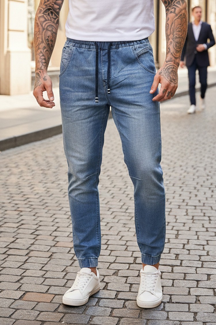 - Sunt confecționați din denim de bumbac pentru un confort maxim. Modelul are talie elastică cu legături.