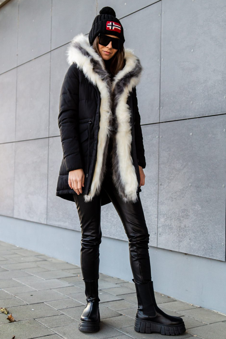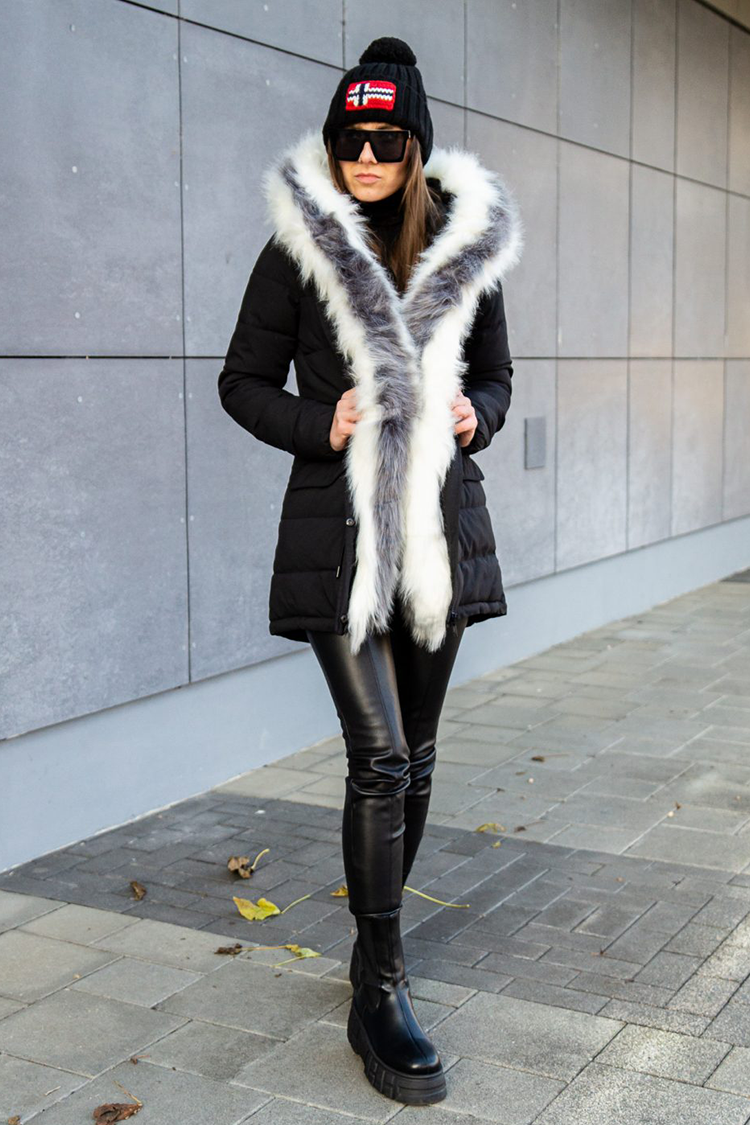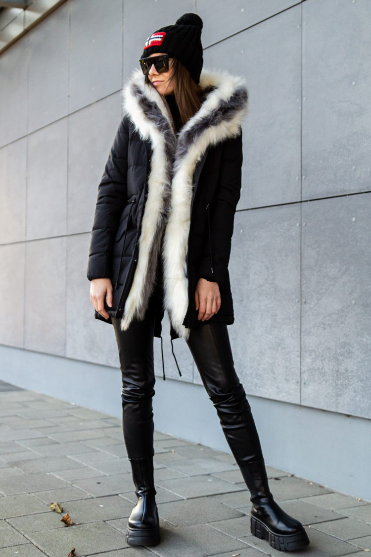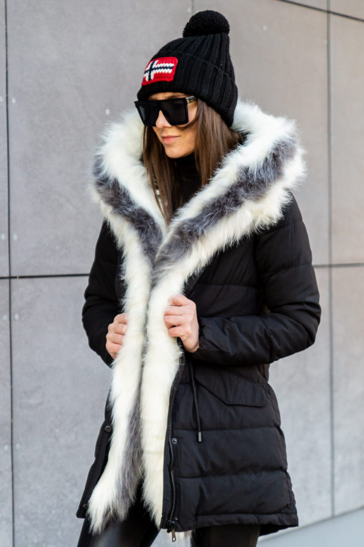 - Modelul are o croială confortabilă, închidere cu fermoar și nasturi și are o glugă voluminoasă cu puf pe toată lungimea.