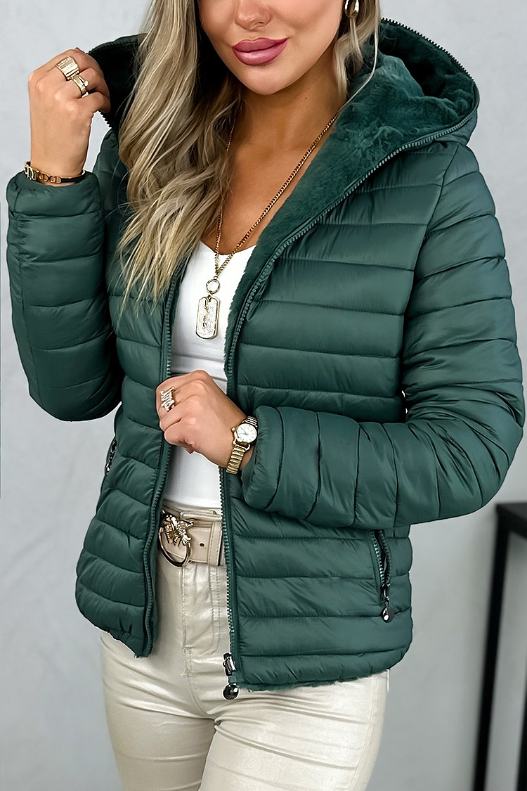 - Modelul are o croială confortabilă, glugă, buzunare, puf pe toată lungimea și se închide cu fermoar.