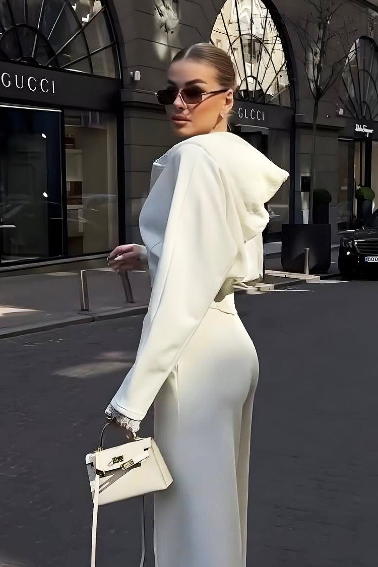 - Hanoracul are fermoar și o glugă spectaculoasă, iar pantalonii au talie înaltă cu legături și picioare late.