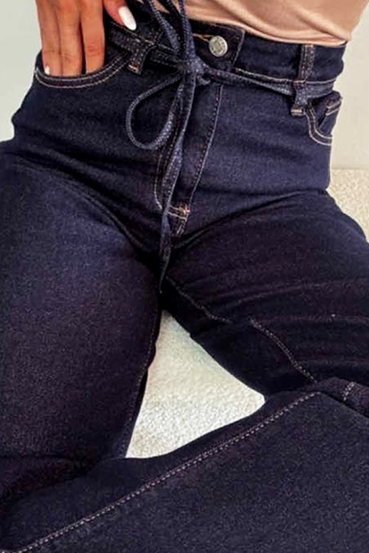 - Modelul are talie înaltă, croială confortabilă, buzunare și curea din denim.