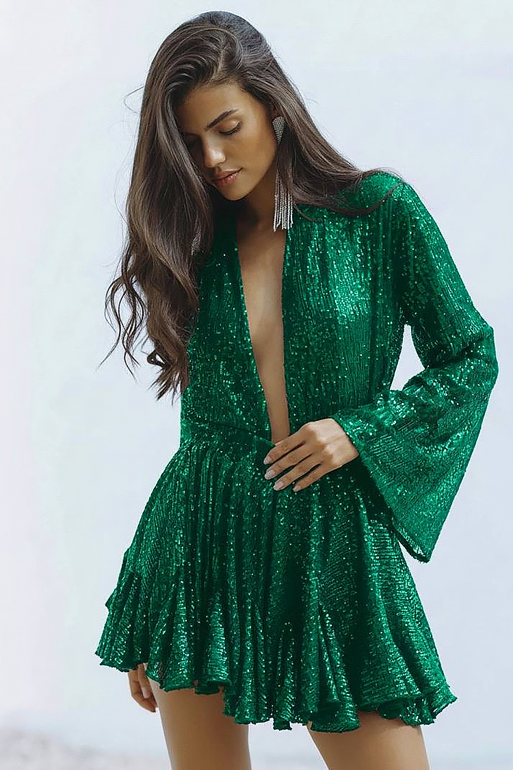 - Pentru un look perfect, alege această rochie scurtă cu un design atractiv de culoare verde.