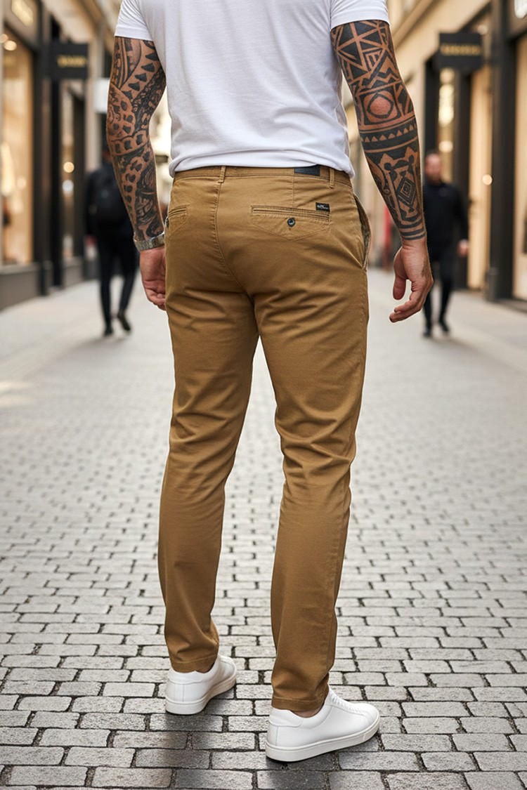 - Model basic de pantaloni de tip chino pentru bărbăti cu croială dreaptă, de culoare maro deschis, potriviți atât pentru ținute de zi cu zi, cât și pentru ținute mai elegante.
