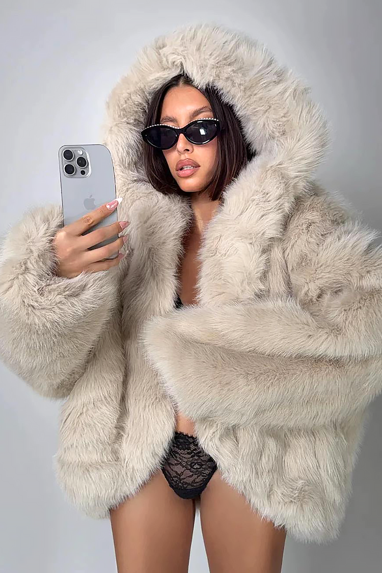 - Modelul este monocromatic din, blană ecologică și o glugă incredibil de voluminoasă.