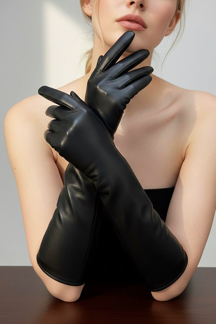 - Creează un look impresionant cu mănuși lungi de dama din piele ecologică.
