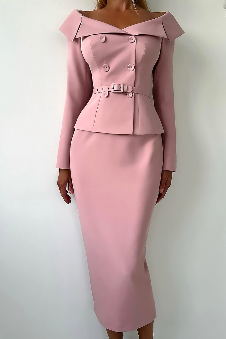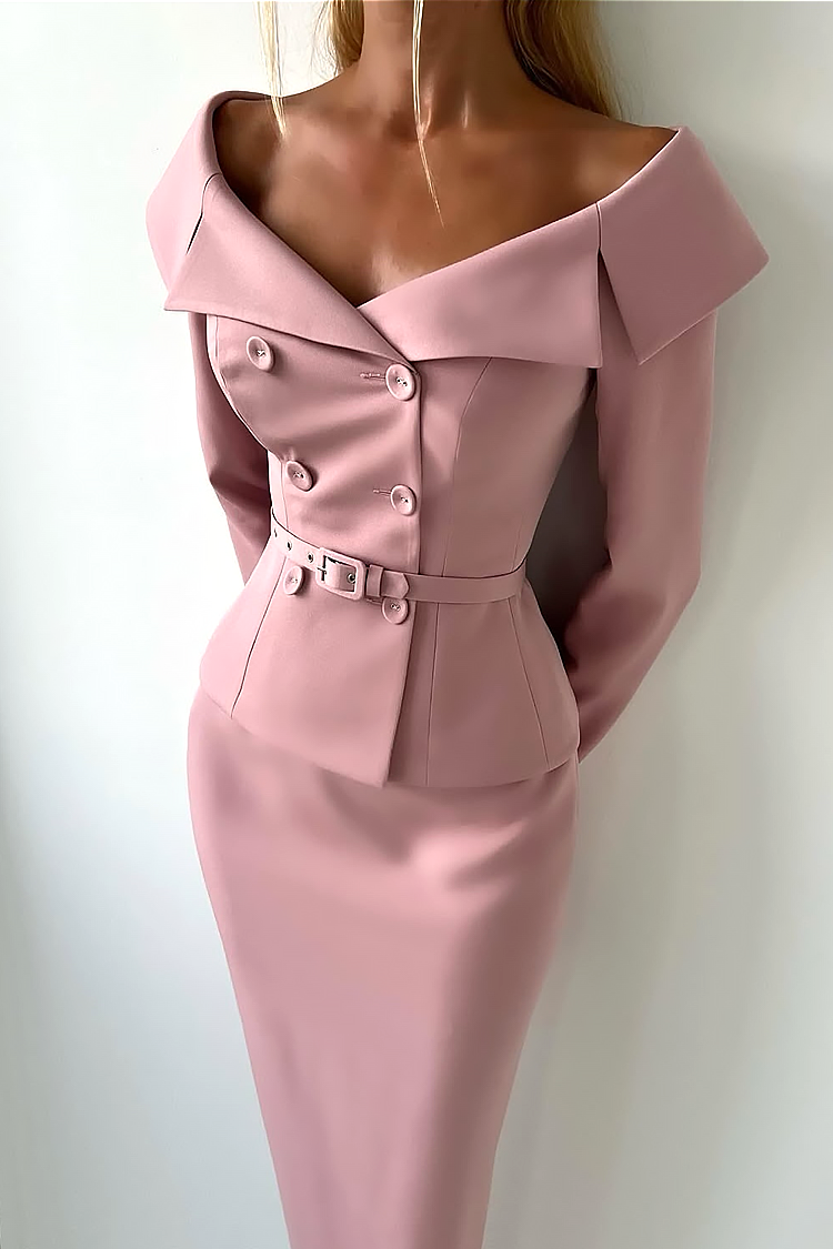 - Sacou are o croială elegantă, nasturi, o curea stilată și un guler spectaculos cu umeri descheiați, iar fusta are lungime midi și croială clasică.
