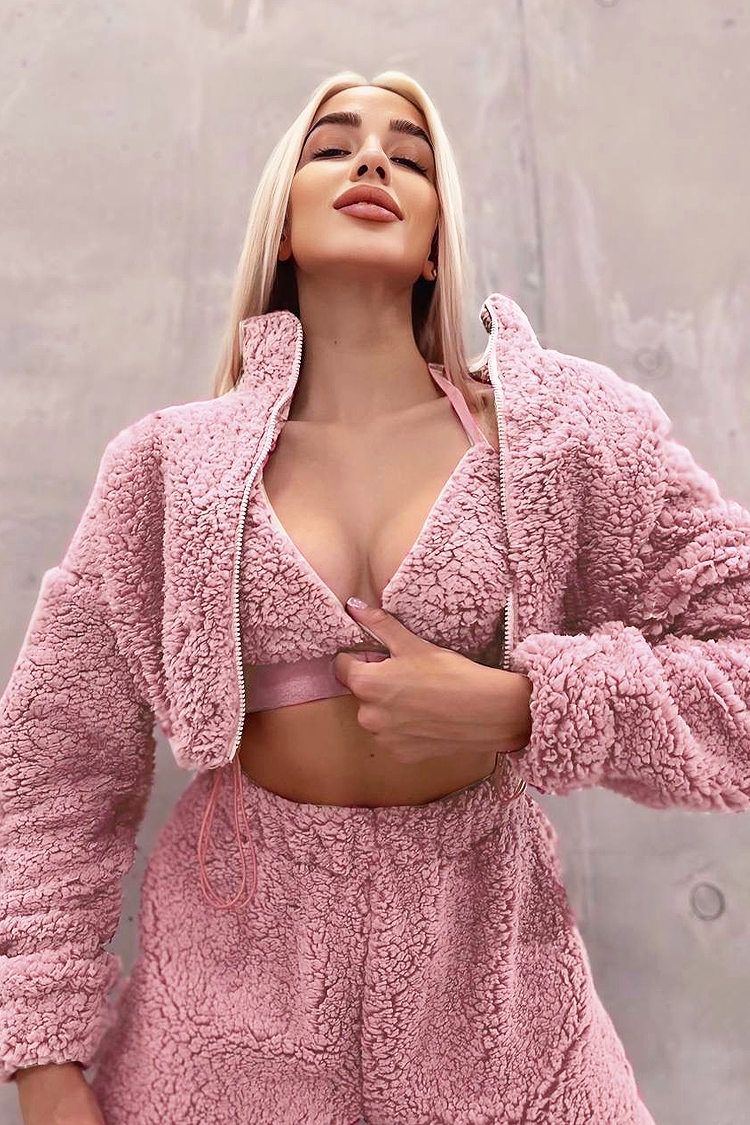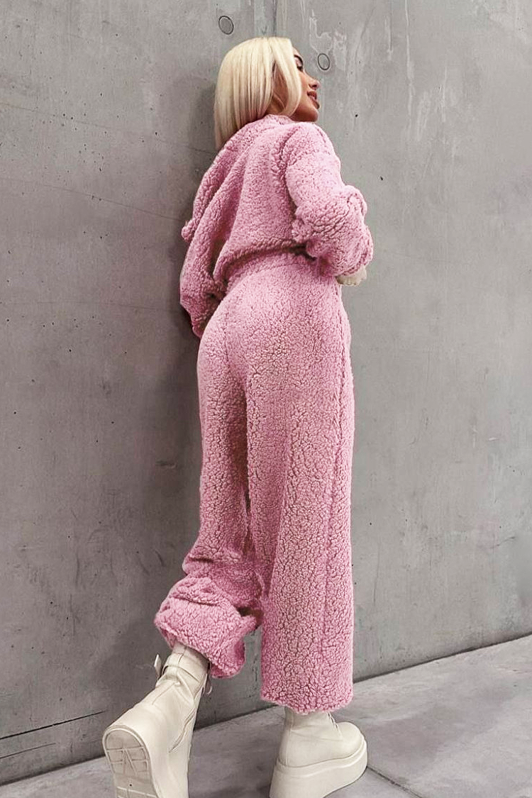 - Hanoracul are fermoar și glugă, pantalonii au o croială confortabilă, iar bustiera are un design crop și decupat.