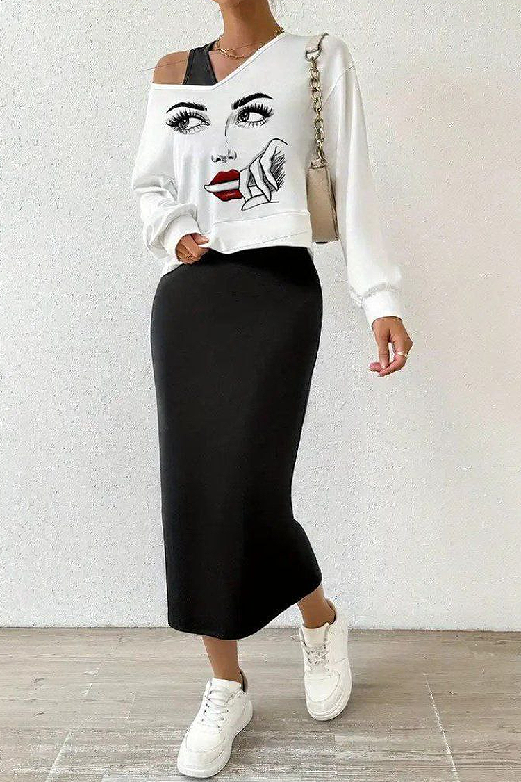 - Rochia este de culoare neagră clasică, iar bluza are un umăr căzut spectaculos și un imprimeu colorat.