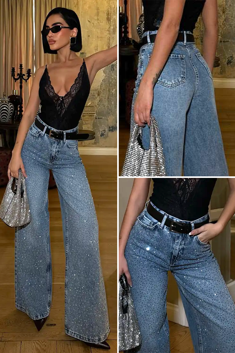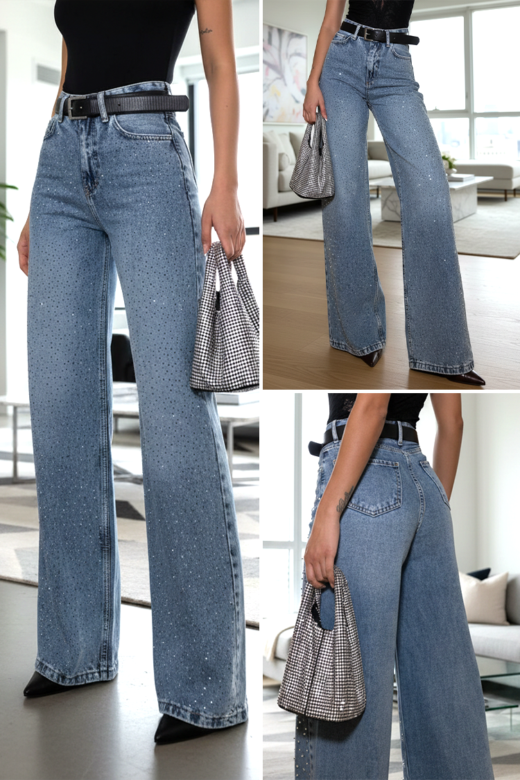 - Modelul are talie înaltă, picioare late și elemente decorative strălucitoare.