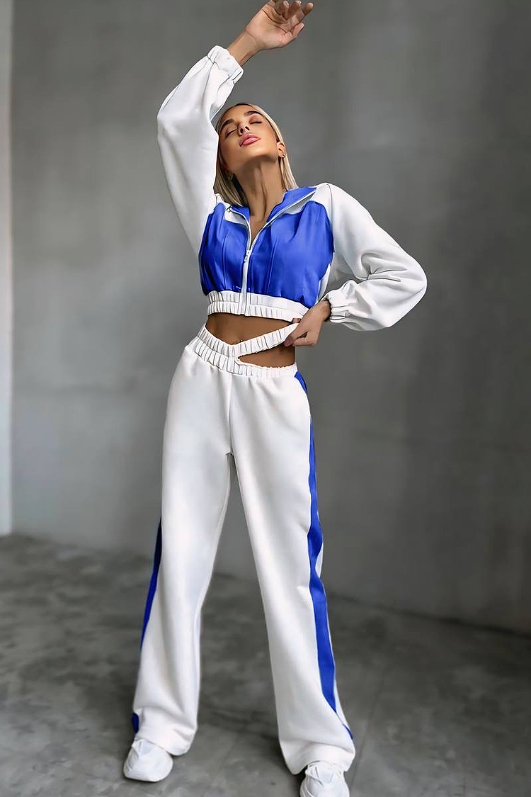 - Hanoracul are fermoar și glugă practică, iar pantalonii au talia înaltă, elastică și picioare late.