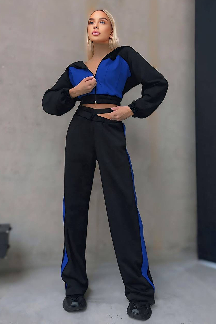 - Hanoracul are fermoar și glugă practică, iar pantalonii au talia înaltă, elastică și picioare late.