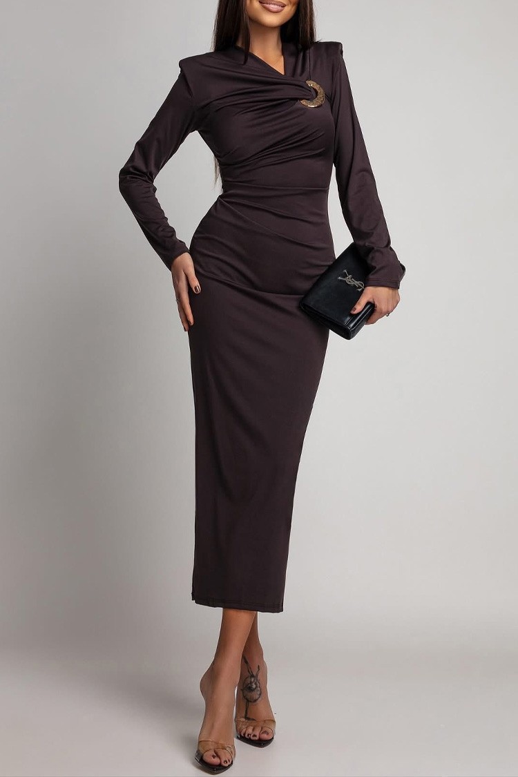 - Modelul are un decolteu spectaculos cu detalii metalice, mâneci lungi și o crăpătură la spate.