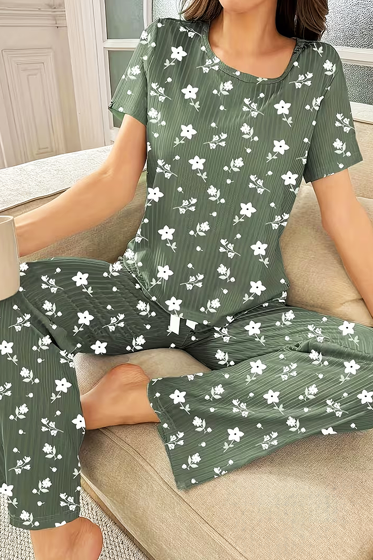 - Partea de sus are mâneci scurte și o croială lejeră, iar pantalonii au talia înaltă și picioare confortabile.