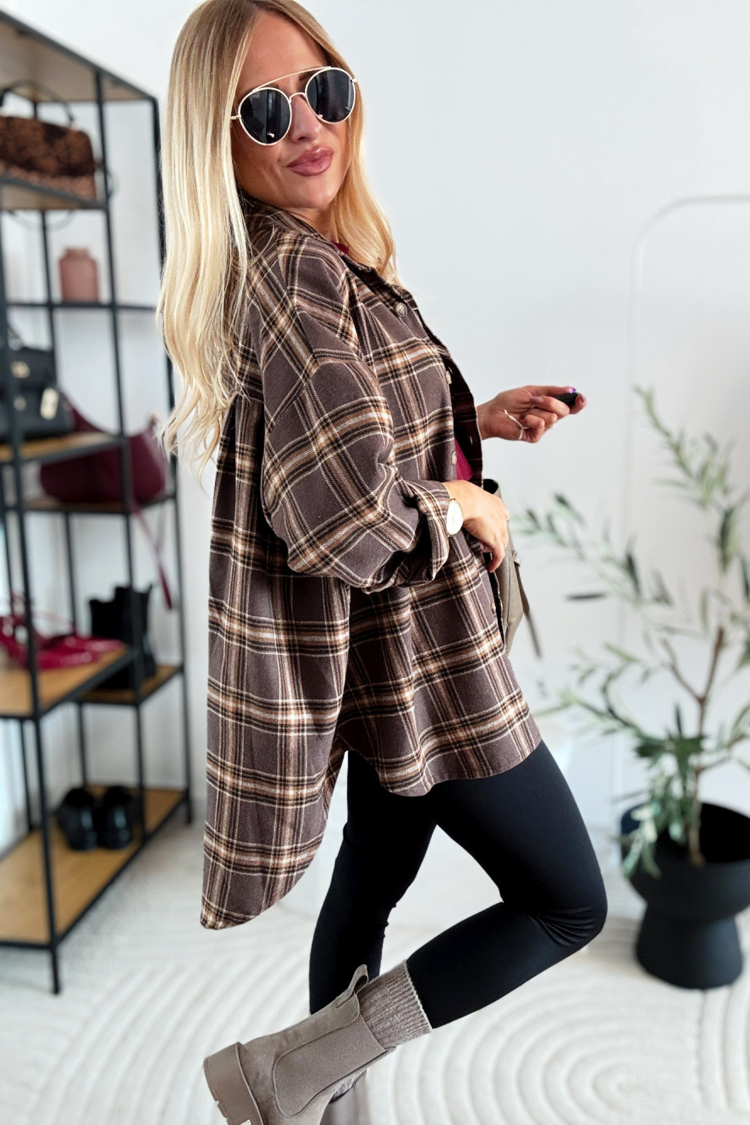 - Modelul are un design în carouri, închidere standard cu nasturi și un design oversize.