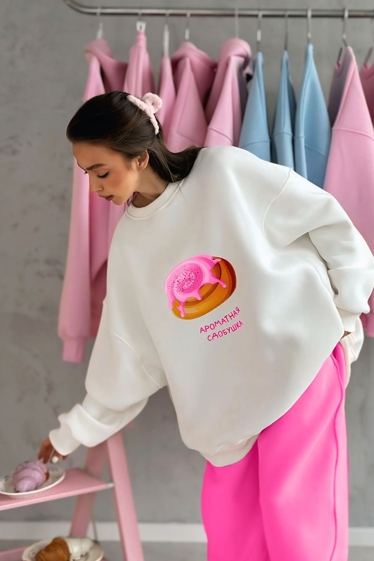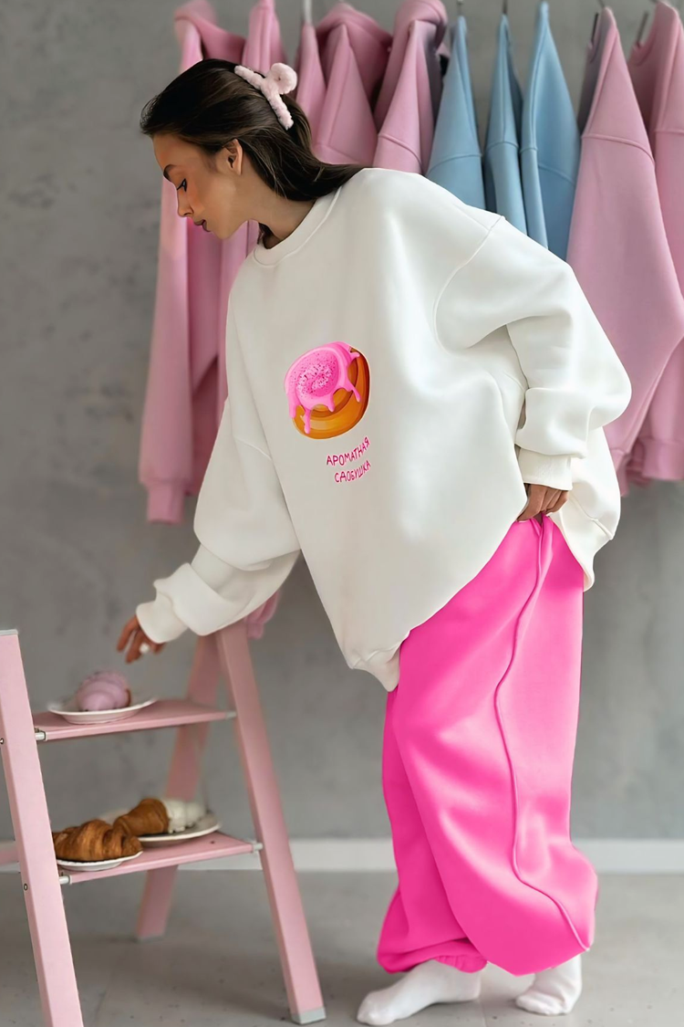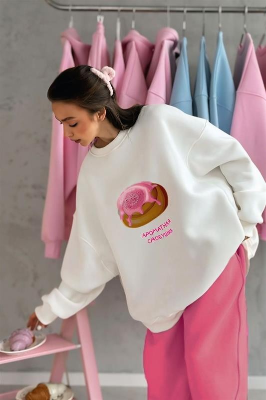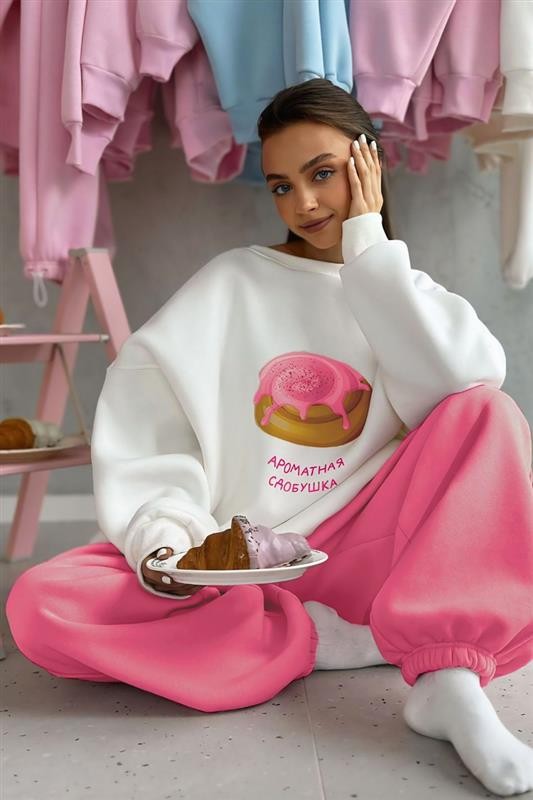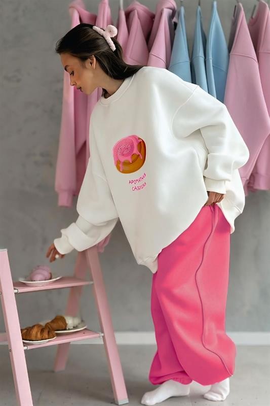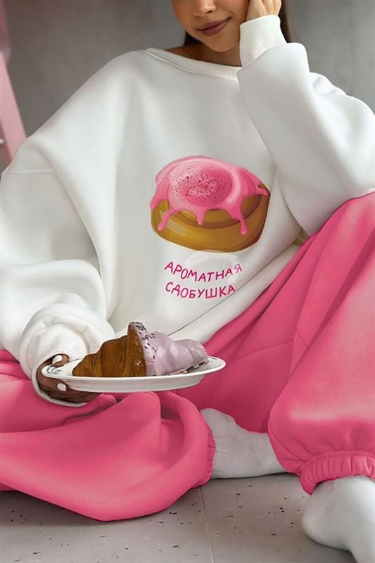 - Setul este format dintr-o bluză oversize cu un imprimeu atrăgător, combinată cu pantaloni cu o croială lejeră și confortabilă.