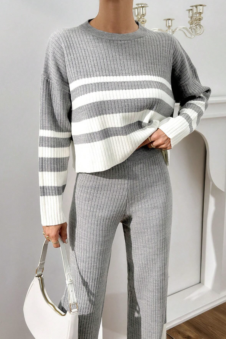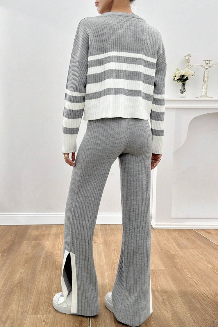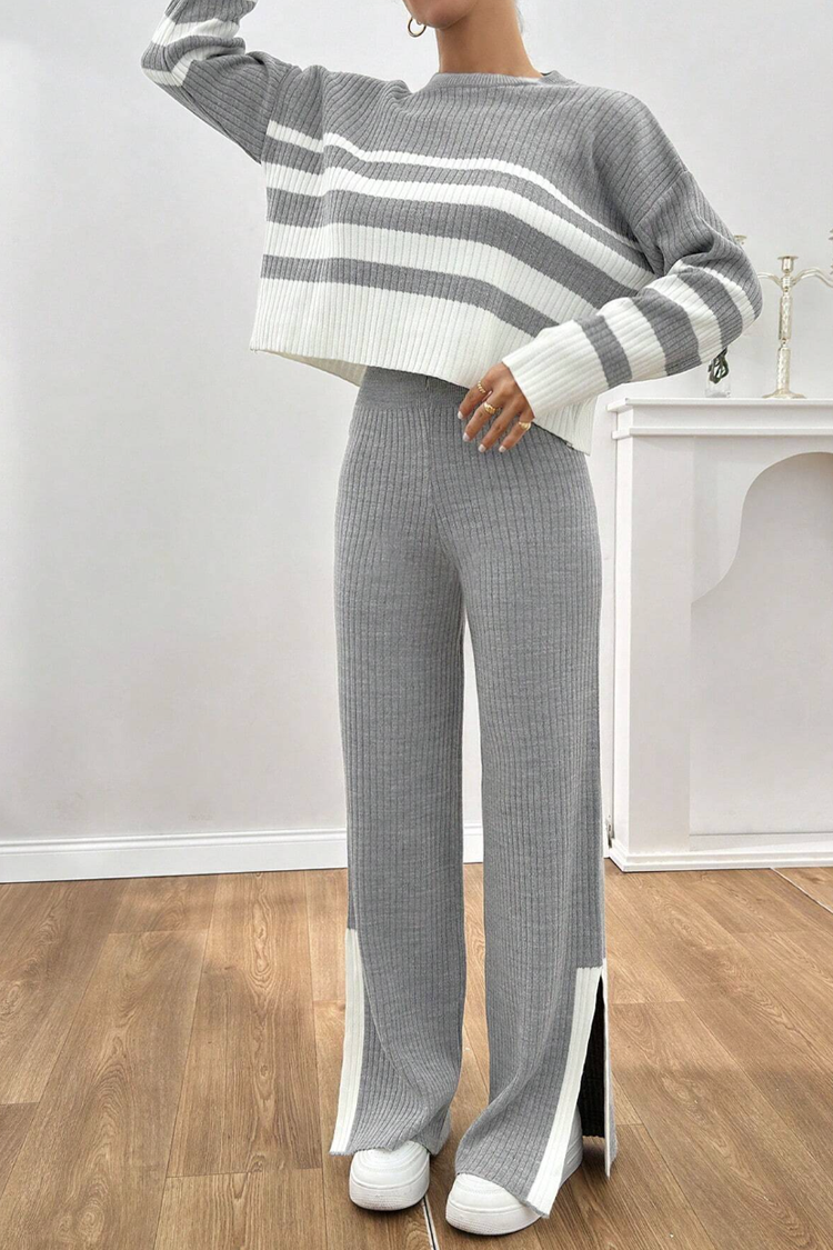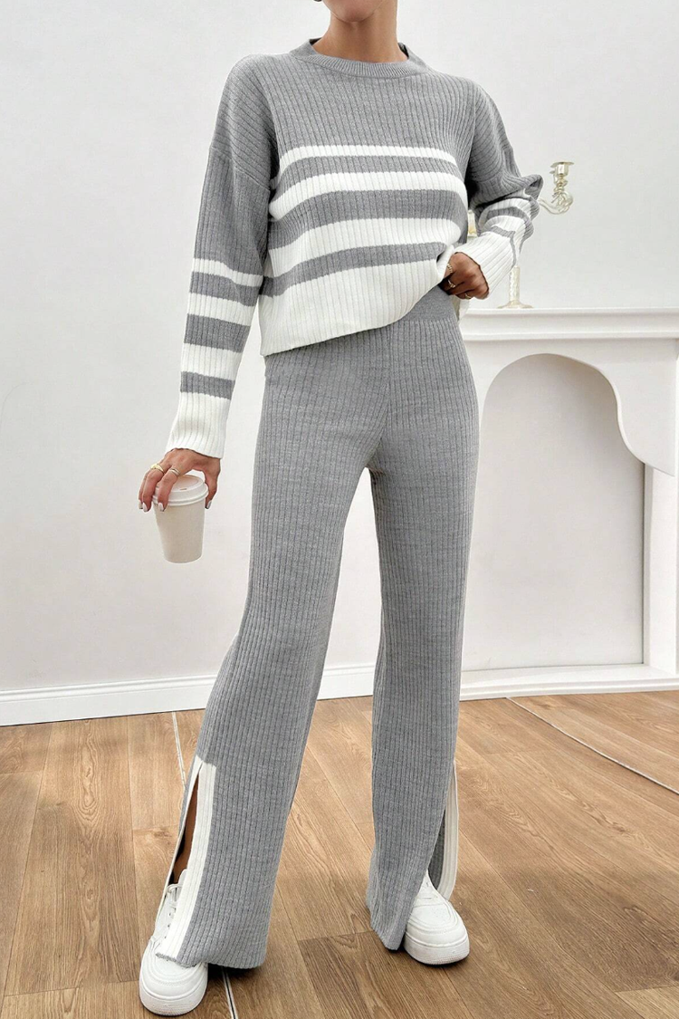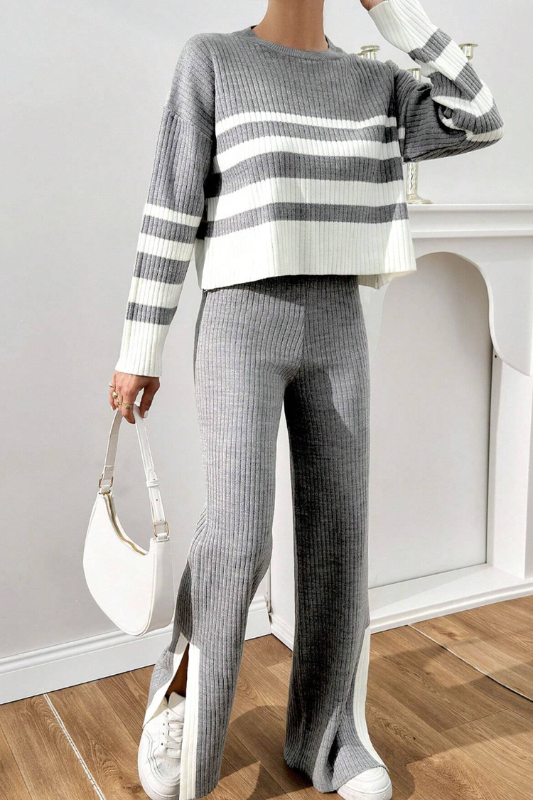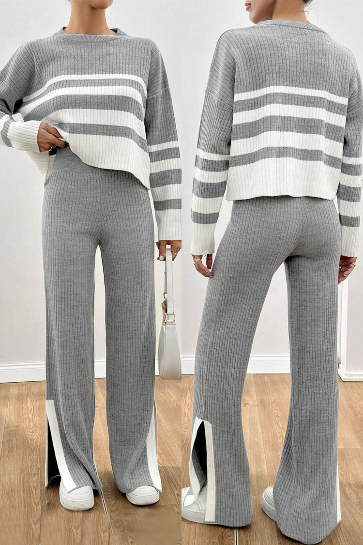 - Puloverul are o croială clasică, iar pantalonii au talia înaltă și picioare spectaculoase.