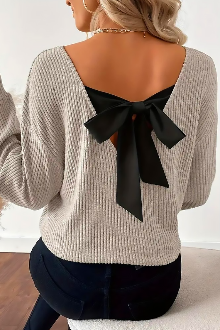 - Modelul are decolteu V și o panglică decorativă la spate.