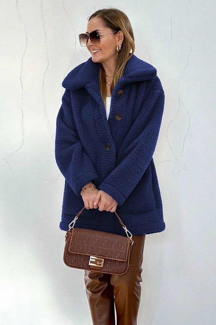 - Modelul are un design clasic, buzunare practice, guler voluminos și nasturi în față.