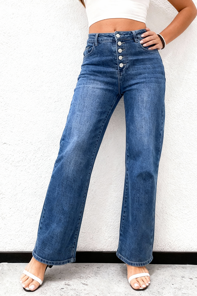 - Modelul are talie înaltă, croială lejeră, nasturi și un efect decolorat modern.