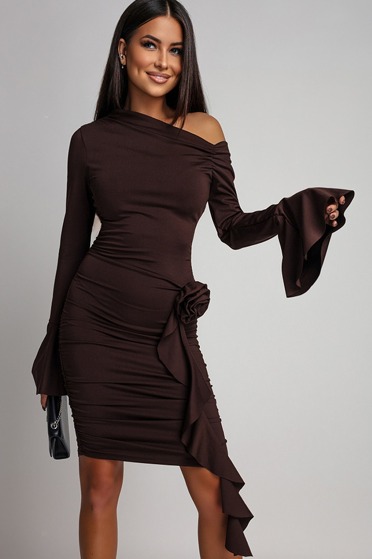 - Modelul monocromatic are mâneci lungi, o croială mulată, un umăr căzut și un trandafir spectaculos în talie.
