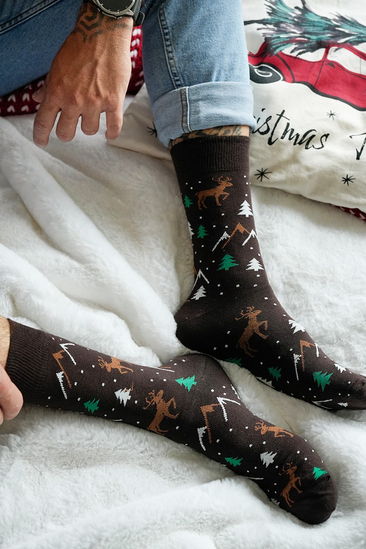 - Șosete pentru bărbăti de culoare maro cu motive de Crăciun și manșetă elastică.