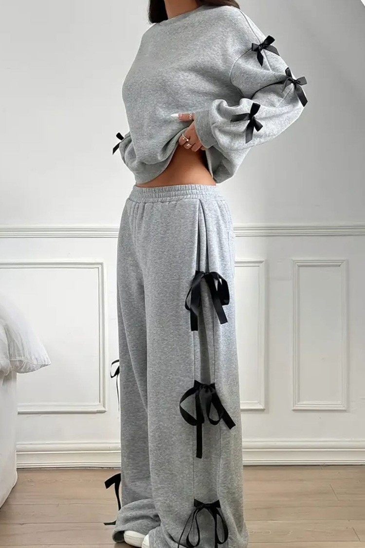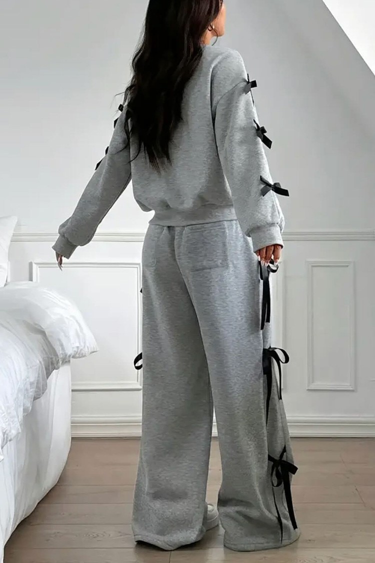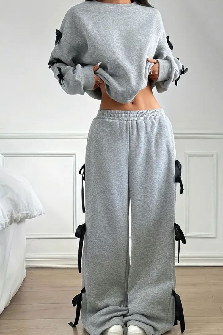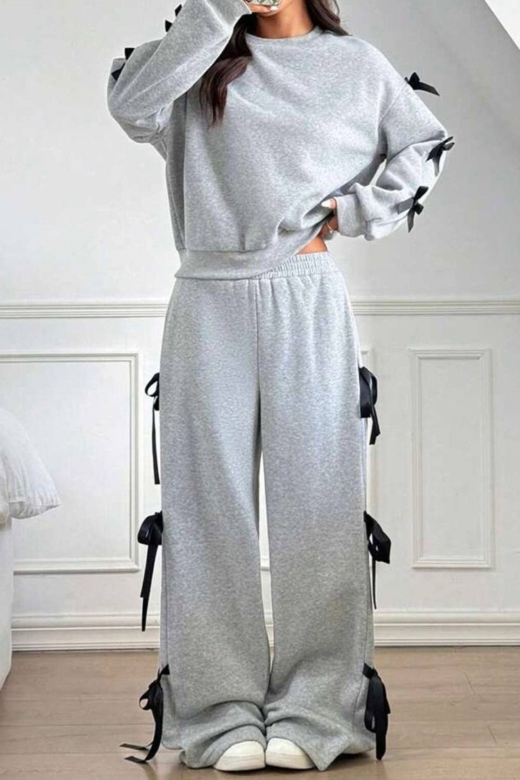 - Setul este format dintr-o bluză și pantaloni oversize cu o croială lejeră și panglici pe toată lungimea.