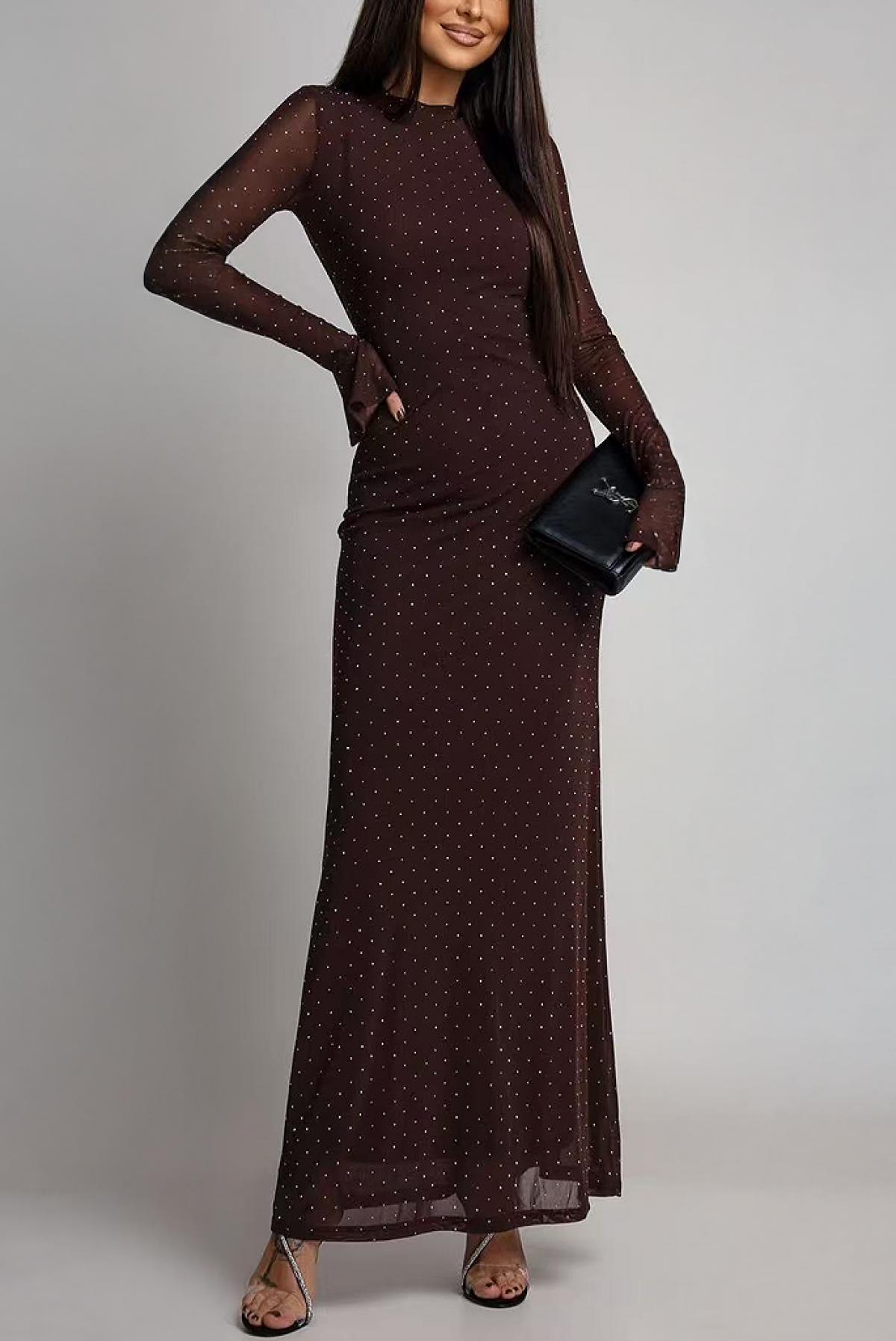 - Modelul are o croială mulată, mâneci lungi, detalii strălucitoare și spatele gol.